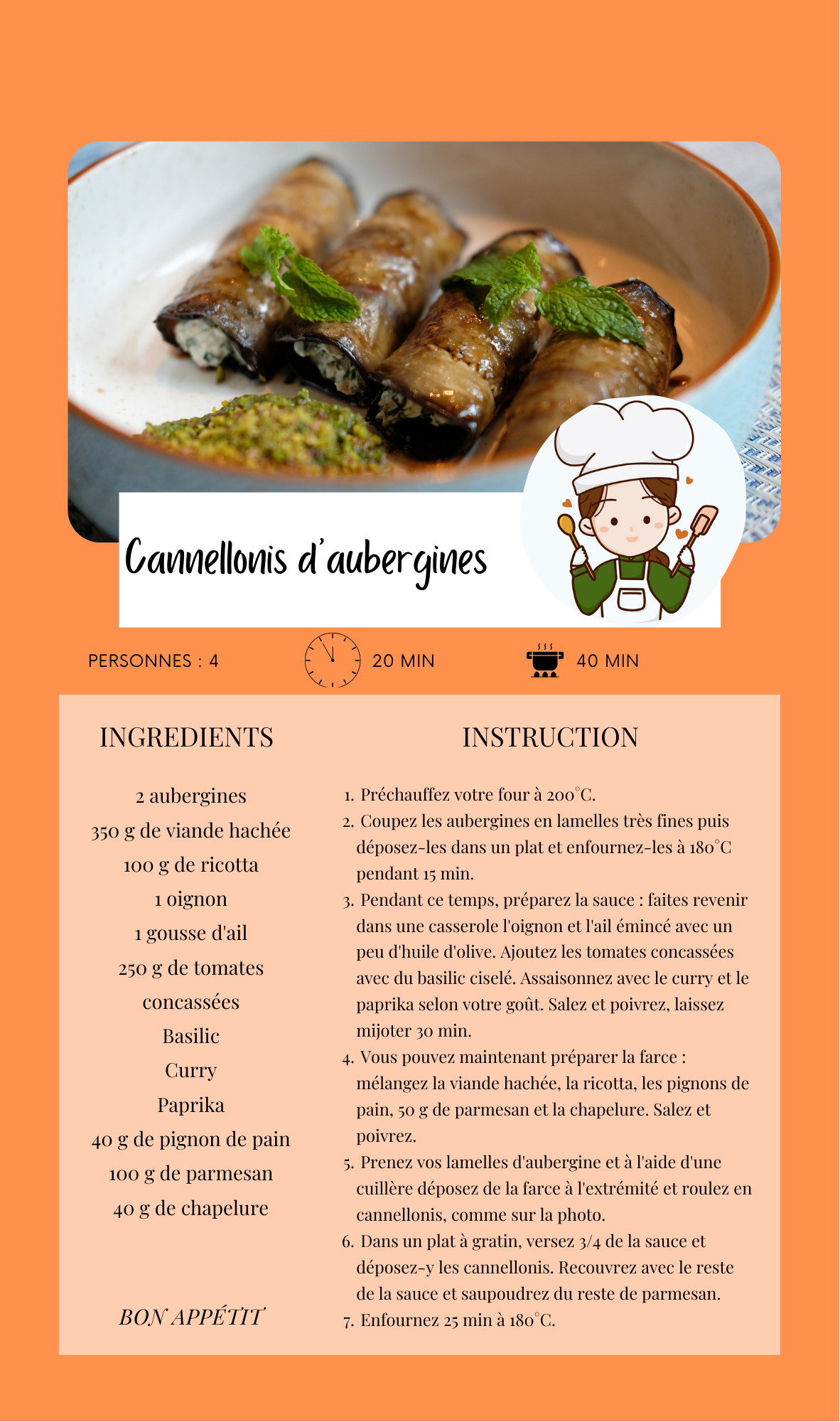 - Prenez vos lamelles d’aubergine et à l’aide d’une cuillère déposez de la farce à l’extrémité et roulez en cannellonis, comme sur la photo.