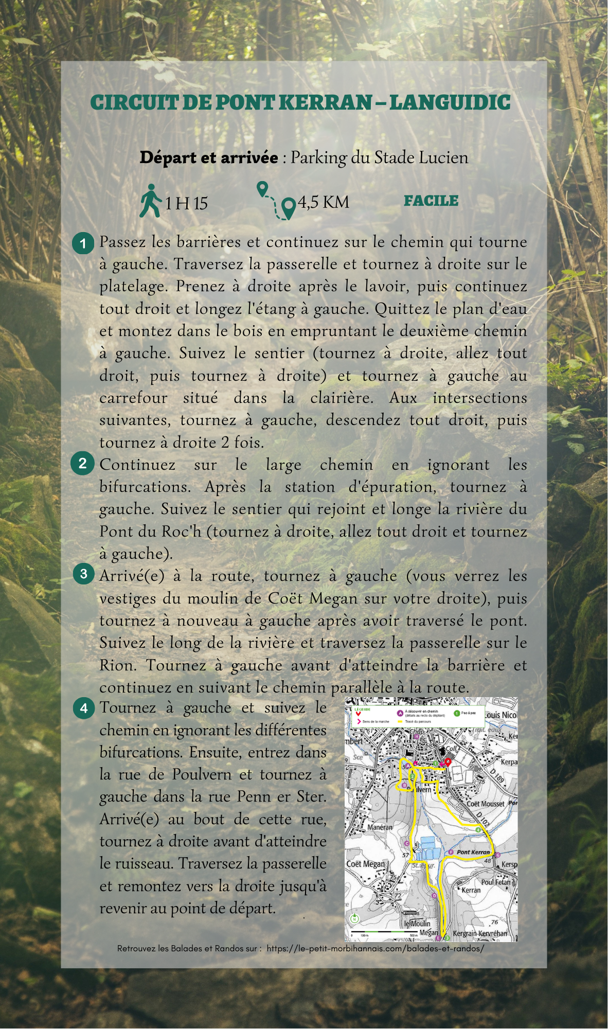 - Continuez sur le large chemin en ignorant les bifurcations. Après la station d’épuration, tournez à gauche. Suivez le sentier qui rejoint et longe la rivière du Pont du Roc’h (tournez à droite, allez tout droit et tournez à gauche).