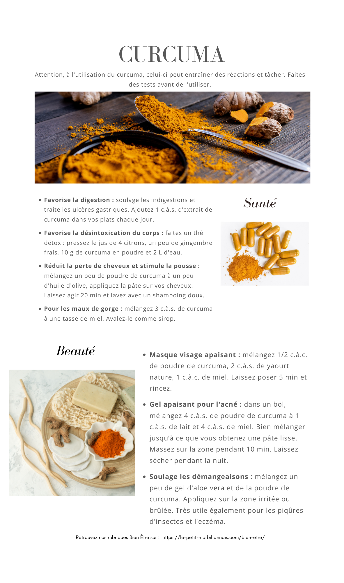 - Masque visage apaisant : mélangez 1/2 c.à.c. de poudre de curcuma, 2 c.à.s. de yaourt nature, 1 c.à.c. de miel. Laissez poser 5 min et rincez.