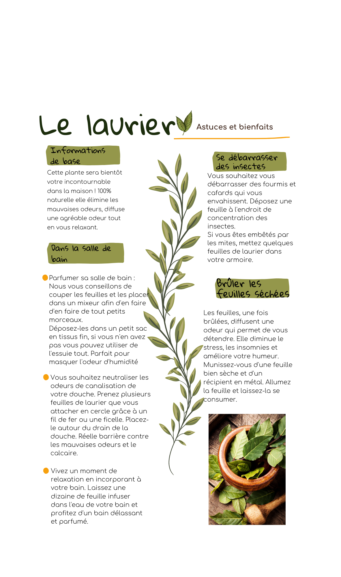 -Vous souhaitez neutraliser les odeurs de canalisation de votre douche. Prenez plusieurs feuilles de laurier que vous attachez en cercle grâce à un fil de fer ou une ficelle. Placez-le autour du drain de la douche. Réelle barrière contre les mauvaises odeurs et le calcaire.