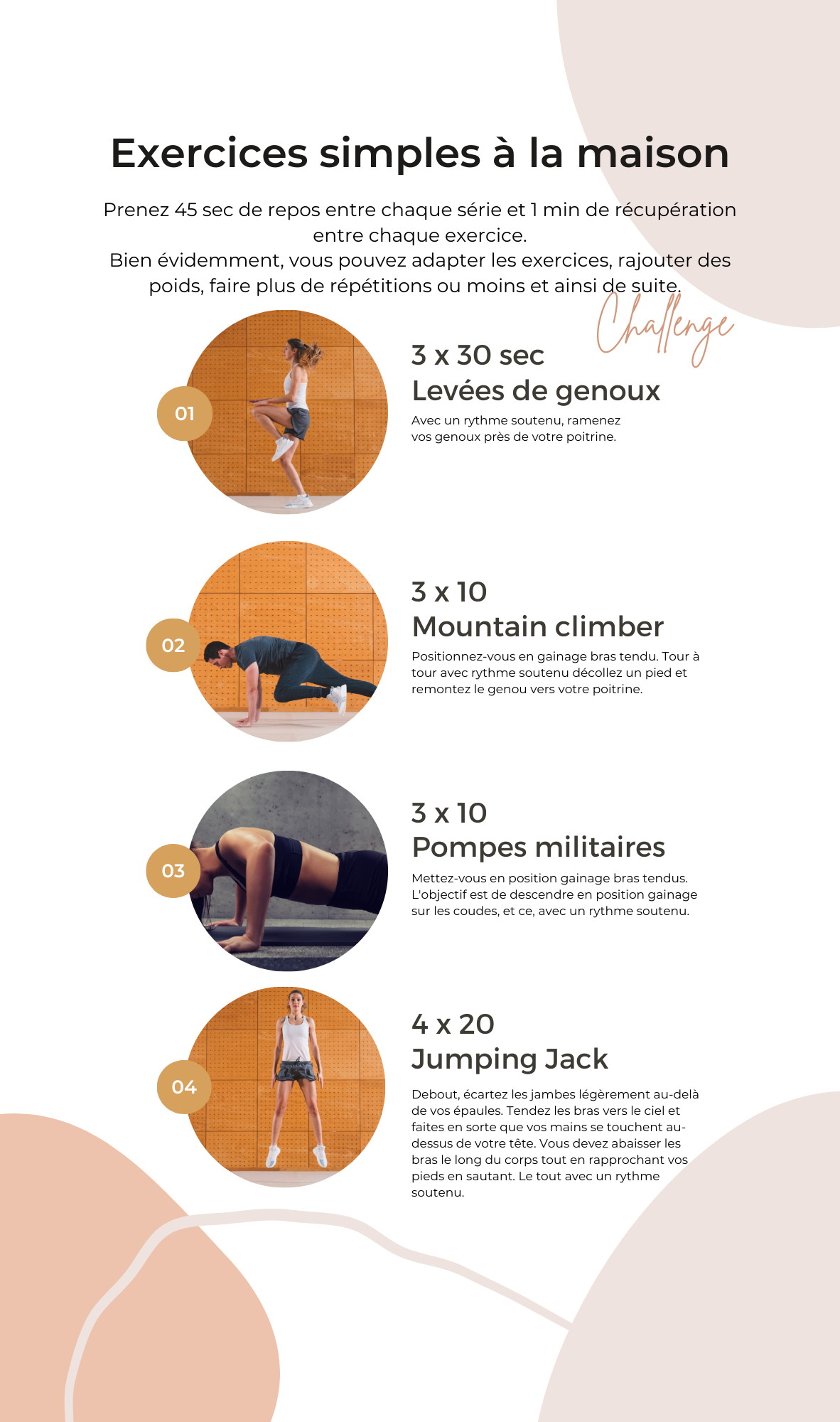 Prenez 45 sec de repos entre chaque série et 1 min de récupération entre chaque exercice. Bien évidemment, vous pouvez adapter les exercices, rajouter des poids, faire plus de répétitions ou moins et ainsi de suite.
