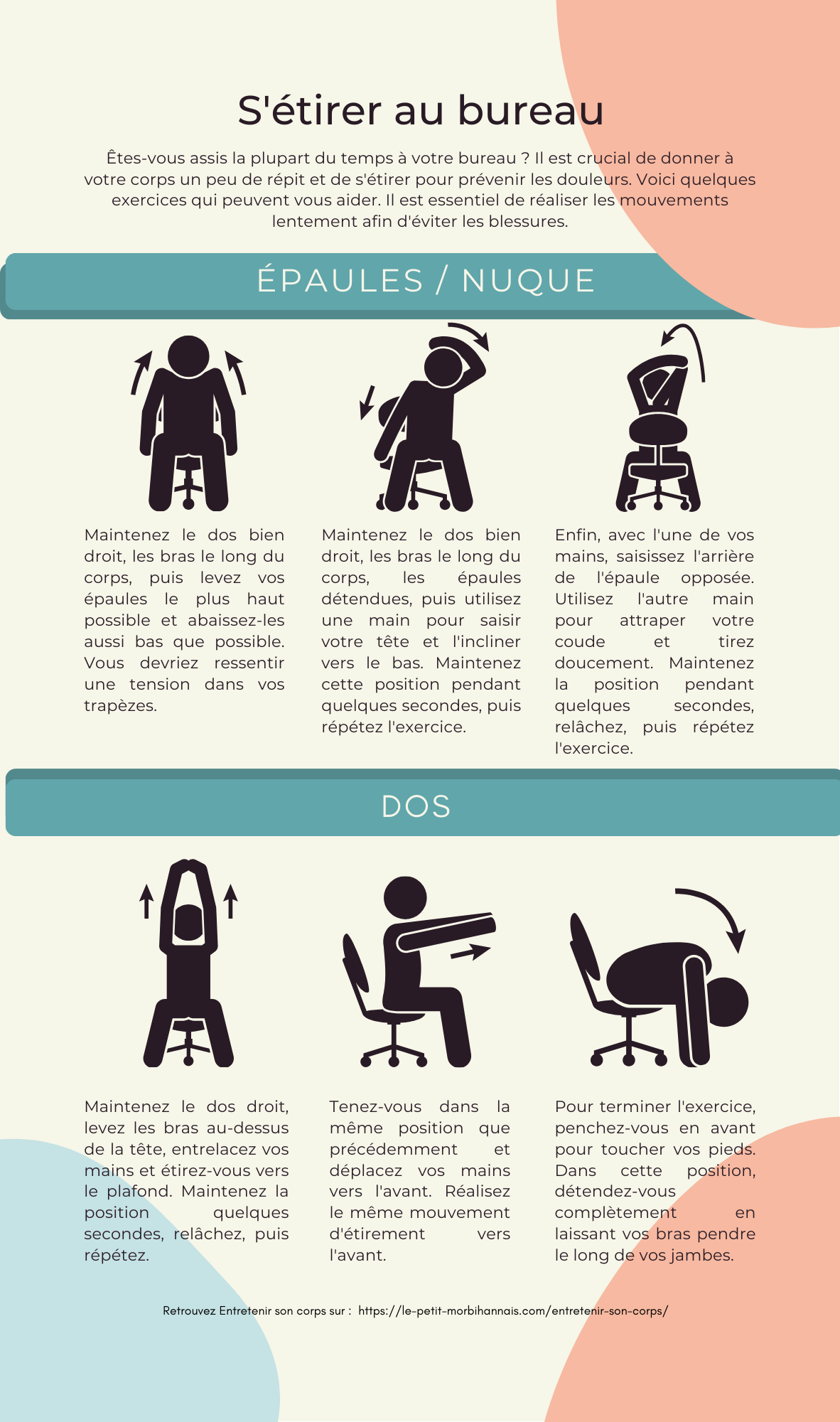 - Enfin, avec l’une de vos mains, attrapez l’arrière de l’épaule opposée. À l’aide de l’autre main, attrapez votre coude et tirez. Toujours en douceur, gardez la position quelques secondes, relâchez et recommence