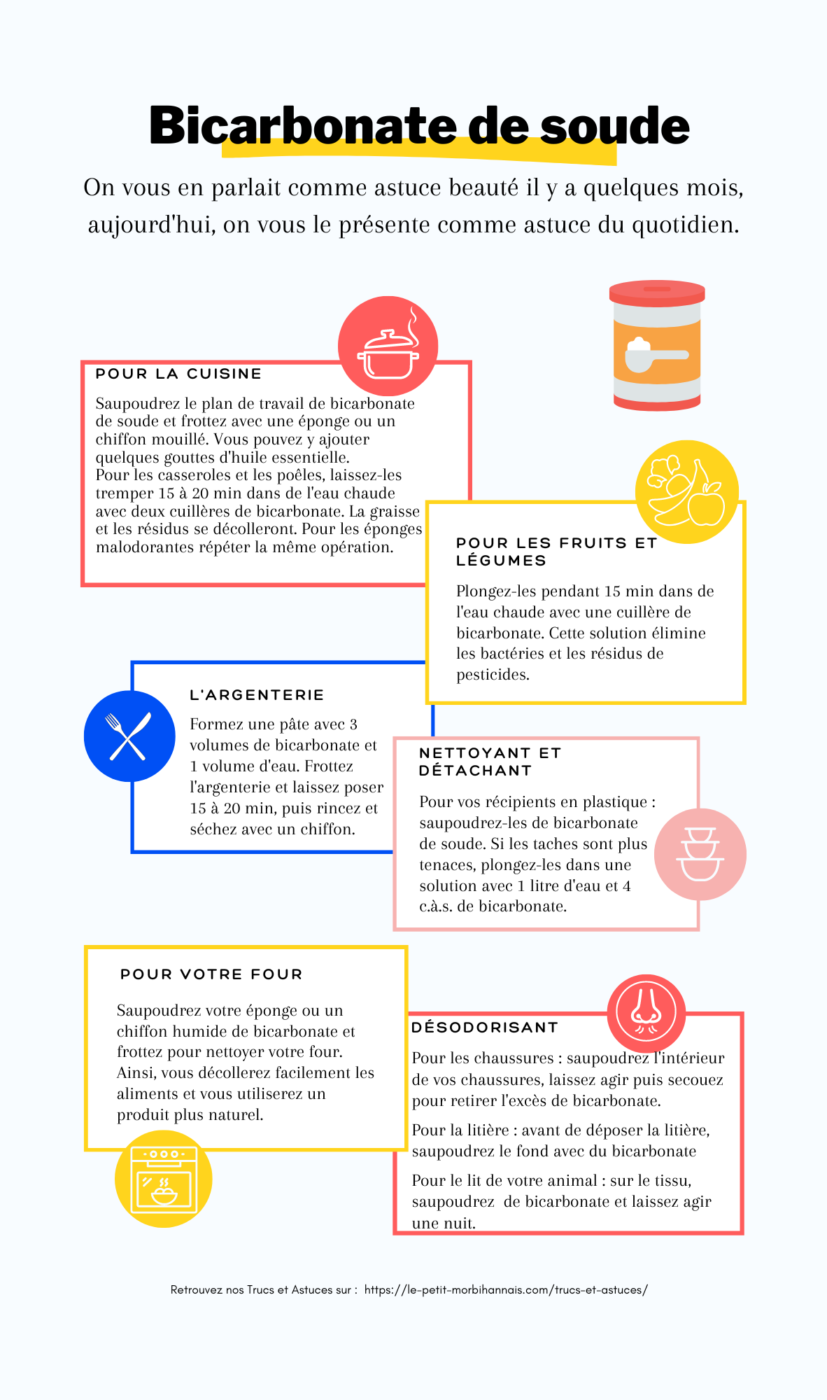 Désodorisant : pour les chaussures : saupoudrez l’intérieur de vos chaussures, laissez agir puis secouez pour retirer, pour la litière : avant de déposer la litière saupoudrez le fond avec du bicarbonate, pour le lit de votre animal : sur le tissu, saupoudrez et laissez agir une nuit.