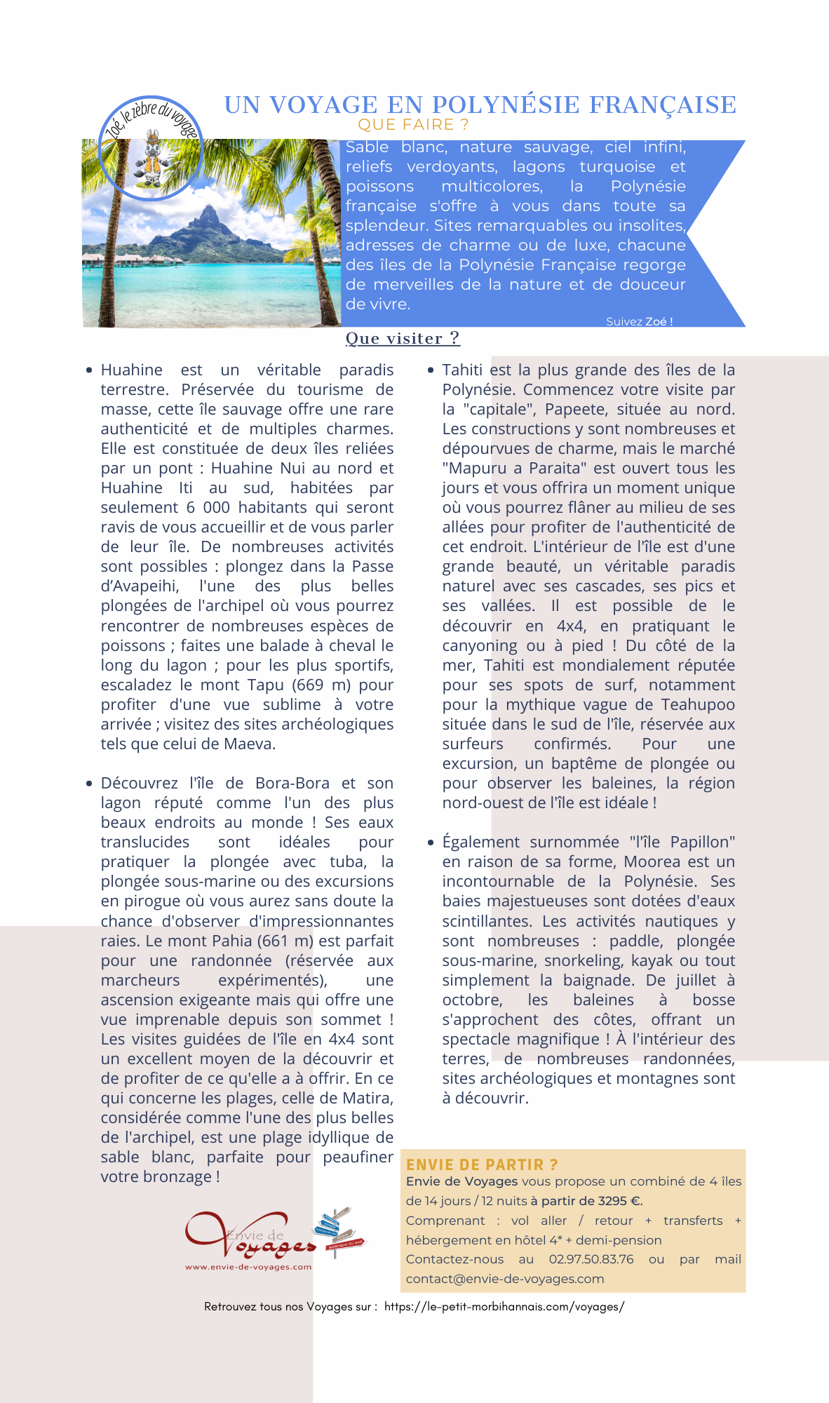 Sable blanc, nature sauvage, ciel infini, reliefs verdoyants, lagons turquoise et poissons multicolores, la Polynésie française s’offre à vous dans toute sa splendeur. Sites remarquables ou insolites, adresses de charme ou de luxe, chacune des îles de la Polynésie Française regorge de merveilles de la nature et de douceur de vivre. Suivez Zoé !