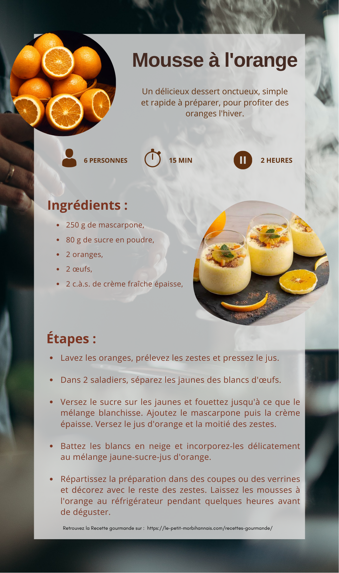 Lavez les oranges, prélevez les zestes et pressez le jus. Dans 2 saladiers, séparez les jaunes des blancs d’œufs. Versez le sucre sur les jaunes et fouettez jusqu’à ce que le mélange blanchisse. Ajoutez le mascarpone puis la crème épaisse. Versez le jus d’orange et la moitié des zestes. Battez les blancs en neige et incorporez-les délicatement au mélange jaune-sucre-jus d’orange. Répartissez la préparation dans des coupes ou des verrines et décorez avec le reste des zestes. Laissez les mousses à l’orange au réfrigérateur pendant quelques heures avant de déguster.