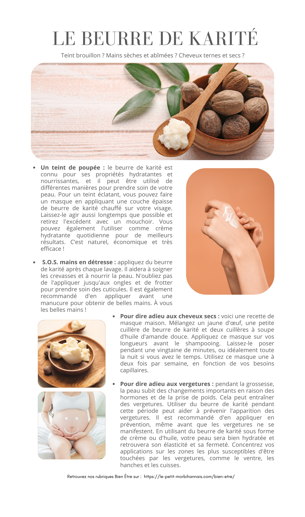 Pour dire adieu aux vergetures : pendant la grossesse, la peau subit des changements importants en raison des hormones et de la prise de poids. Cela peut entraîner des vergetures. Utiliser du beurre de karité pendant cette période peut aider à prévenir l’apparition des vergetures. Il est recommandé d’en appliquer en prévention, même avant que les vergetures ne se manifestent. En utilisant du beurre de karité sous forme de crème ou d’huile, votre peau sera bien hydratée et retrouvera son élasticité et sa fermeté. Concentrez vos applications sur les zones les plus susceptibles d’être touchées par les vergetures, comme le ventre, les hanches et les cuisses.