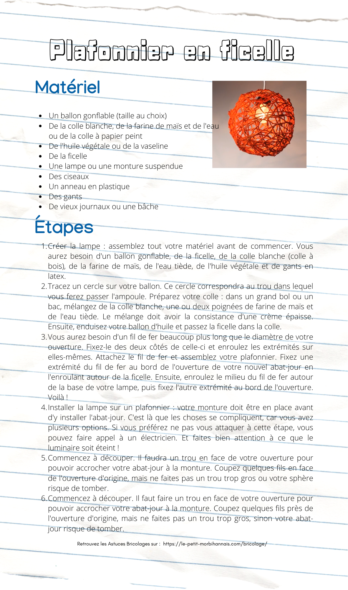 - Vous aurez besoin d’un fil de fer beaucoup plus long que le diamètre de votre ouverture. Fixez-le des deux côtés de celle-ci et enroulez les extrémités sur elles-mêmes. Attachez le fil de fer et assemblez votre plafonnier. Fixez une extrémité du fil de fer au bord de l’ouverture de votre nouvel abat-jour en l’enroulant autour de la ficelle. Ensuite, enroulez le milieu du fil de fer autour de la base de votre lampe, puis fixez l’autre extrémité au bord de l’ouverture. Voilà !