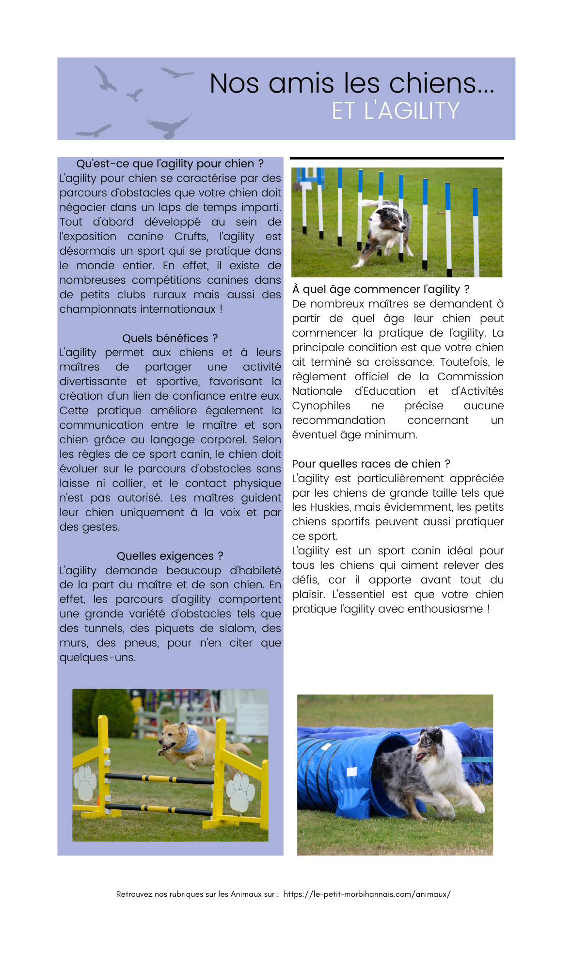 À quel âge commencer l’agility ? De nombreux maîtres se demandent à partir de quel âge leur chien peut commencer la pratique de l’agility. La principale condition est que votre chien ait terminé sa croissance. Toutefois, le règlement officiel de la Commission Nationale d’Education et d’Activités Cynophiles ne précise aucune recommandation concernant un éventuel âge minimum. Pour quelles races de chien ? L’agility est particulièrement appréciée par les chiens de grande taille tels que les Huskies, mais évidemment, les petits chiens sportifs peuvent aussi pratiquer ce sport. L’agility est un sport canin idéal pour tous les chiens qui aiment relever des défis, car il apporte avant tout du plaisir. L’essentiel est que votre chien pratique l’agility avec enthousiasme !