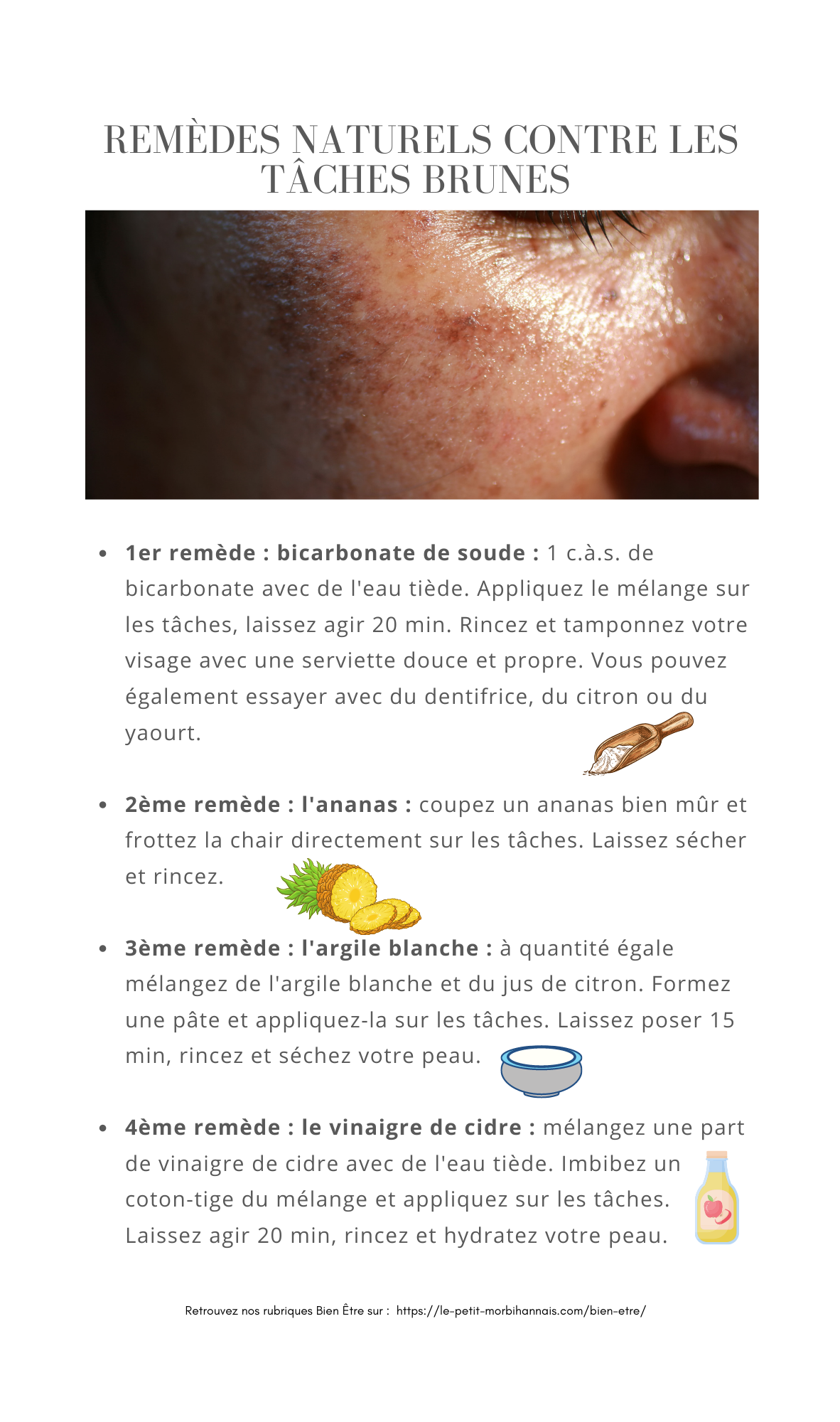 - 1er remède : bicarbonate de soude : 1 c.à.s. de bicarbonate avec de l’eau tiède. Appliquez le mélange sur les taches, laissez agir 20 min. Rincez et tamponnez votre visage avec une serviette douce et propre. Vous pouvez également essayer avec du dentifrice, du citron ou du yaourt.
