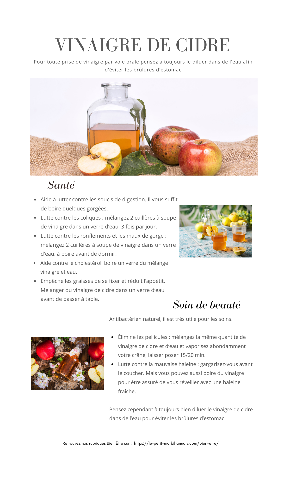 - Lutte contre la mauvaise haleine : gargarisez-vous avant le coucher. Mais vous pouvez aussi boire du vinaigre pour être assuré de vous réveiller avec une haleine fraîche. Pensez cependant à toujours bien diluer le vinaigre de cidre dans de l’eau pour éviter les brûlures d’estomac.